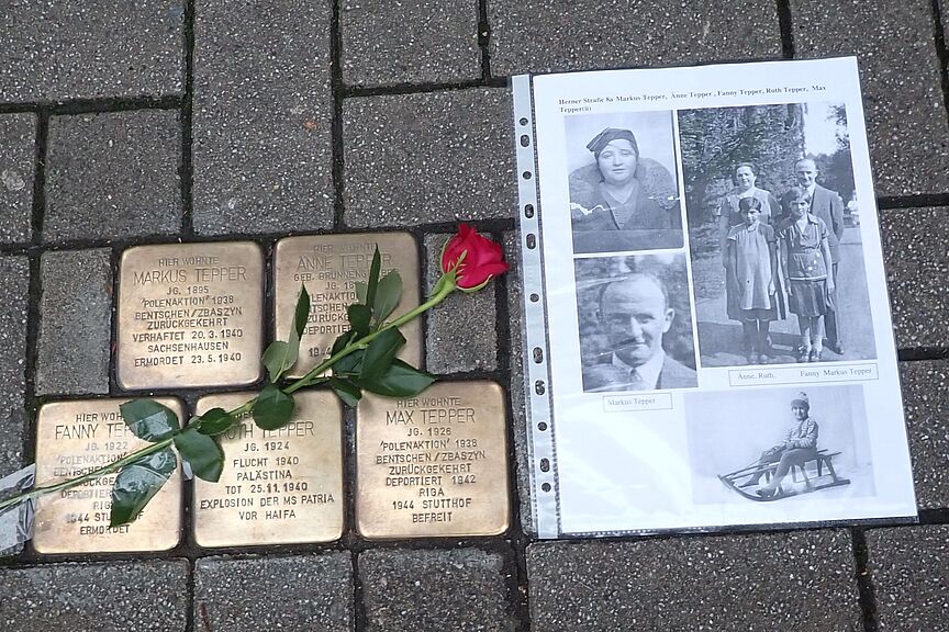 Zum Gedächtnis legten die Teilnehmerinnen und Teilnehmer Rosen auf die Stolpersteine und gedachten anhand der Bilder und Geschichten der Menschen, die hier einst gelebt hatten.