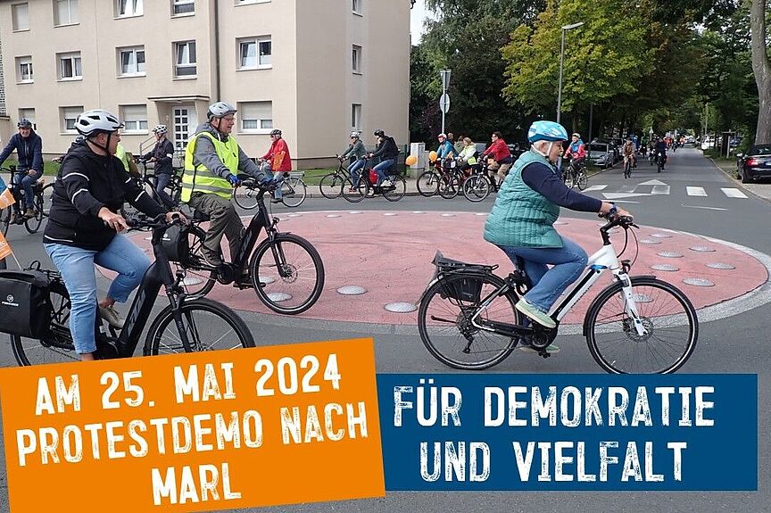 Die Fahrraddemonstration unter dem Motto „Für Vielfalt – gegen Hass und Ausgrenzung! Radeln für die Demokratie“ startet am 25. Mai um 11.30 Uhr am Rathaus Recklinghausen. Nach einer Runde um den Wall geht es über die Straße Am Lohtor und die Halterner Straße nach Marl, zum Bahnhof Sinsen. Die Strecke ist ca. 9 km lang. Bei der erwartet großen Zahl von Teilnehmenden wird die Fahrt ca. eine Stunde dauern.