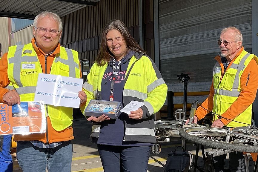 Bei der Fahrradcodierung des ADFC bei einem Sicherheits- und Gesundheitstag im Coca-Cola-Werk am 17. Oktober wurde die magische Zahl von 1.000 Fahrradcodierungen im Kreis Recklinghausen in diesem Jahr geknackt.