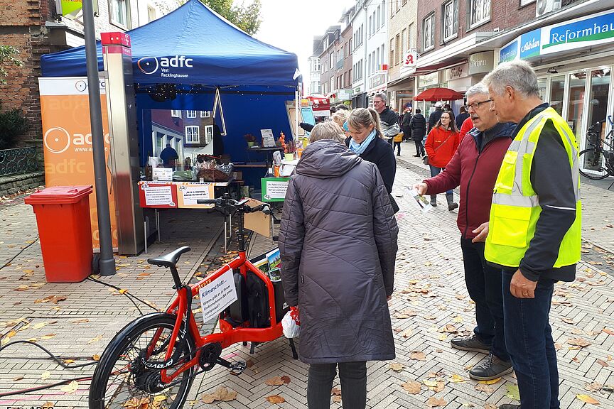 Ein knallrotes Lastenrad weckte das Interesse der Besucher*innen, sich über eine umweltbewusste Alternative zum Auto beispielsweise beim Einkauf zu informieren.